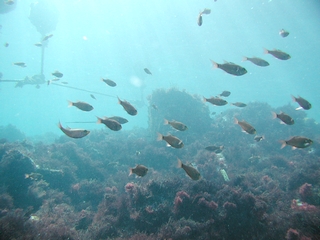 ようやく全員揃って移動を開始した。透視度はこの辺りで10m位だろうか。細かい海草だかゴミだかが漂っていて、それほど良くはない。でも、ここの海はクリスタルな印象がある。沖縄とかバリの海はもっと開放的でソフトな雰囲気を感じるが、ここ富戸の海はもっと硬質な感じがする。泳ぎまわっている魚の色とか形とかによるのだろうか。クリスタルな印象を感じるのは自分だけかも知れないが…。