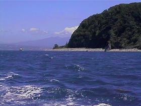 海から見る西伊豆の山もボチボチ色づいている秋の大瀬崎。ボートのヘリから少し身を乗り出して海底を透かして見ると岩肌がまだら模様に揺れている。