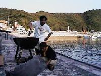 この日の夕飯は港でのバーベキューだった。座間味港の横の段々になっている所でドラム缶を縦半分にした手作りのコンロに炭をおこし、午後6時半から鉄板焼きパーティーが始まった。が、スタッフの加藤クン、どうもうまく火を起こせない。それを見ていてついつい手が出てしまった。