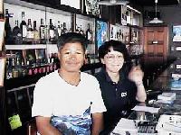 夕飯は昨日と同じ6時半、というのでシャワーを浴びてさっぱりとした所で民宿を出た。「アルデバラン」は座間味にそぐわないような洒落た作りで、外が暗くなってから飲んでると、フッと横浜か川崎のパブにいるような錯覚すら起こす。そんな店のカウンターに陣取り、オーナー手作りの料理をつまみにワイフとビールで乾杯する。そのまま自然とログブックのサイン交換に入り、今日の昼、無人島に渡った若者に「E-Mailで情報交換しよう」と名刺を差し出すと、