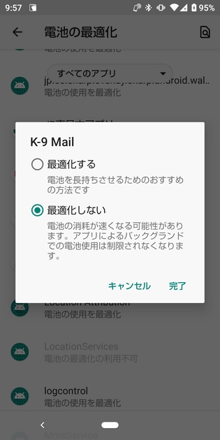 8.K-9 Mailの「同期停止」を回避する ◇設定1.「K-9 mail」をバックグラウンドで常時動かしておくための設定(Android 8.0 には無いかも) [設定]→[電力管理]→[自動起動マネージャ]→[K-9 Mailを許可] ◇設定2.スリープ状態でも「K-9 mail」の動作を止めさせないための設定 [設定]→[電池]→[右上の:]→[電池の最適化]→[最適化していないアプリ]を[すべてのアプリ]→[K-9 Mailを最適化しない] ※Android 14 では ◇[電池]→ K-9 mailを「バックグラウンドで実行」(制限しない)にする ◇ K-9 mailの[アプリの情報]で[通知]を許可、すべての[権限]を許可する ※Android 9.0 では ◇[設定][電池][アプリ起動]→ K-9 mailが[自動的に管理]になっているので、オフ[手動で管理]にする(「自動起動」「他のアプリによる起動」「バックグラウンドで実行」は「オン」のまま) ◇[設定][アプリ][アプリ][右上の:][特別なアクセス][電池の最適化][すべてのアプリ](許可しないが初期表示されているかも)→ K-9 Mailを「許可しない」 ※スマホ「AQUOS SH-M12」の場合、バックグラウンドで常時動かしておくための設定はありません ◇[設定][アプリと通知][アプリをすべて表示]→K-9 Mailを選択 →[詳細設定][電池][電池の最適化][最適化していないアプリ]を[すべてのアプリ]→ K-9 Mailを「最適化しない」 ※Android10.0 スマホ「AQUOS SH-M12」の場合、Android10.0にバージョンアップされましたが、9.0と同じ設定でした ※Android11.0 スマホ「AQUOS SH-M12」の場合、Android11.0にバージョンアップされましたが、9.0と同じ設定で回避されました ![]() |
