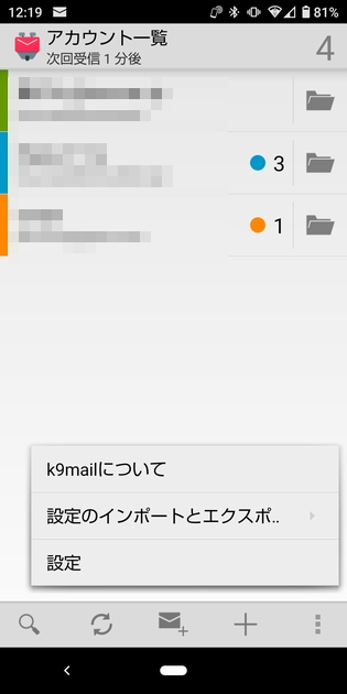 11.K-9 Mailの設定をエクスポートする ※やった方がベター 右下の[:]をタップして「設定のインポートとエクスポート」のメニューを表示する ここで「保存」した「設定」はインストールし直した時に正しくインポートできた ![]() |