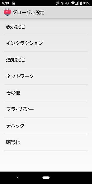6.K-9 Mailの環境をカスタマイズする ・[グローバル設定][表示設定]で -「アカウントのサイズ表示」のチェックを外す -「検索結果の件数表示」のチェックを外す -「特殊なアカウントを隠す」をチェックする -「複数選択チェックボックス」をチェックする ・[グローバル設定][通知設定]で「削除ボタンを表示」の[常に表示する]をチェックする ・[グローバル設定][ネットワーク]で「バックグラウンド同期」の[常時利用]をチェックする ※この設定はとても重要! ・[グローバル設定][プライバシー]で「メールクライアントを隠す」をチェックする ![]() |