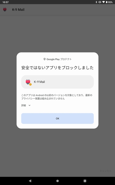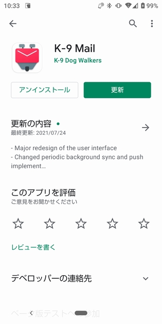 <手順> ※この手順に起因したと思われる、いかなる損害に関する責任は負いません。 ※また、いかなるサポートも致しません。自己責任でお願いします。 (PCで事前に準備) 1.K-9 Mailのダウングレード版「k9-5.600.apk」を入手する (スマホの機種変更などに備えてこちらを推奨) 2.スマホとPCをUSBケーブルで接続する 3.PCからスマホにダウングレード版をコピーする ※スマホのブラウザで当サイトにアクセスし、下記の直リンクから入手しても良い この場合、4.以降を実行する (PCを使わずにスマホだけでインストールする場合) (以降スマホ) 4.K-9 Mailをアンインストールする 5.K-9 Mail(ダウングレード版 k9-5.600.apk)をインストールする 6.K-9 Mailの環境をカスタマイズする 7.メール環境(アカウント)を再設定する 8.K-9 Mailの「同期停止」を回避する 9.スマホを再起動する ※これ重要 10.PlayストアでK-9 Mailの「自動更新」を無効にする ※これも重要 11.K-9 Mailの設定をエクスポートする ※やった方がベター |