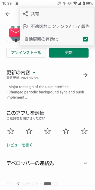 10.PlayストアでK-9 Mailの「自動更新」を無効にする ※これも重要 ☆PlayストアがVer. 5.8xに自動更新してしまうので、「自動更新」を無効にしておく |