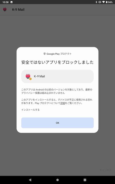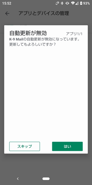 (誤って[はい]をタップした場合は、アンインストールからやり直す) ※ アップデートを手動で更新する場合、毎回表示されるので面倒ですね ※「K-9 Mail 以外」は自動更新されるので、手動更新しなくても良いのですが