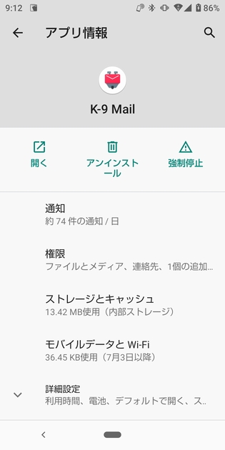 4.K-9 Mailをアンインストールする [設定][アプリと通知][アプリをすべて表示]と進み、一覧の中から「K-9 Mail」をタップする。 ![]() |