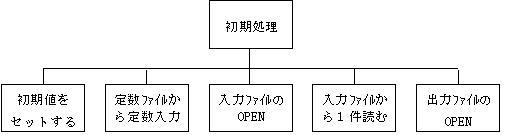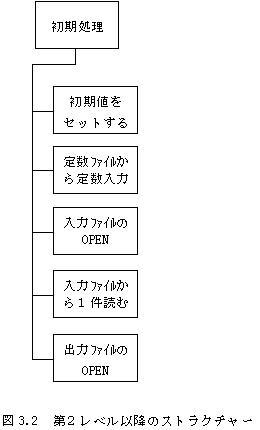 3.展開の方法 topへ戻る ストラクチャーチャートは構造化の基準にしたがい、初期処理、主処理(繰返し処理)、終了処理の3つの部分をドライブする第1レベルの構造図から書き始め、順次各部分の下位レベルにおける制御論理および処理機能モジュールを展開して書き加える方法で作成する。 なお、第1レベルの構造図の主処理部は、繰返し処理する各機能モジュールの制御モジュールとなる。 ![]() 第2レベル以降は、第1レベルの構造図の下部に必要な制御論理および処理機能モジュールを書き加えてゆく。たとえば次のようになる。