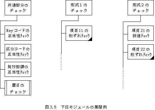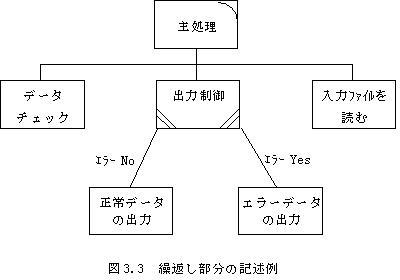 書き方は縦方向でもよい。 ![]() 繰返し処理の部分は次のように書く。 たとえば共通部分を持つ2種類の形式のデータカードの入力チェックの場合を考える。 流れとしては、初期処理で第1レコードが入力された状態からスタートするので、チェック処理→正常またはエラーデータそれぞれの出力→次のレコードの入力、の繰返しとなる。 ![]() データチェックの部分は、まず共通部分(たとえばキーとなるコード、データの作成日付、発行部課などでデータ形式が同一のもの)のチェックから始め、そこでエラーのあったものはチェックを打ち切り、そうでない時は第1形式、第2形式の区分コードによりそれぞれ形式別のチェックをすることにする。 ![]() ストラクチャーチャートの展開はこのレベルで止めてもよい。 しかし、共通部分に含まれる日付のチェックに暦日をチェックする外部ルーチンが含まれていたり、形式1、形式2の各項目のうち6桁の数値フィールドの桁ずれチェックを共通ルーチンで行うというようなことを図示するのであれば、それぞれの処理機能モジュールをさらに分解して図示に書き加えればよい。 図3.5に展開例を示す。 ![]() 次の終了処理は、入出力件数の表示(入力件数、出力件数は入力・出力のそれぞれのモジュールでカウントしておく)と、ファイルのcloseとする。 |